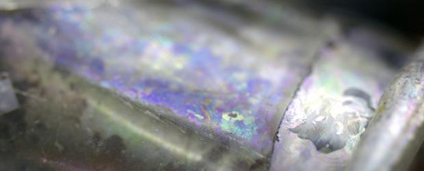 - dunne verweringslaagjes die irisatie vertonen (olie-op-watereffect)