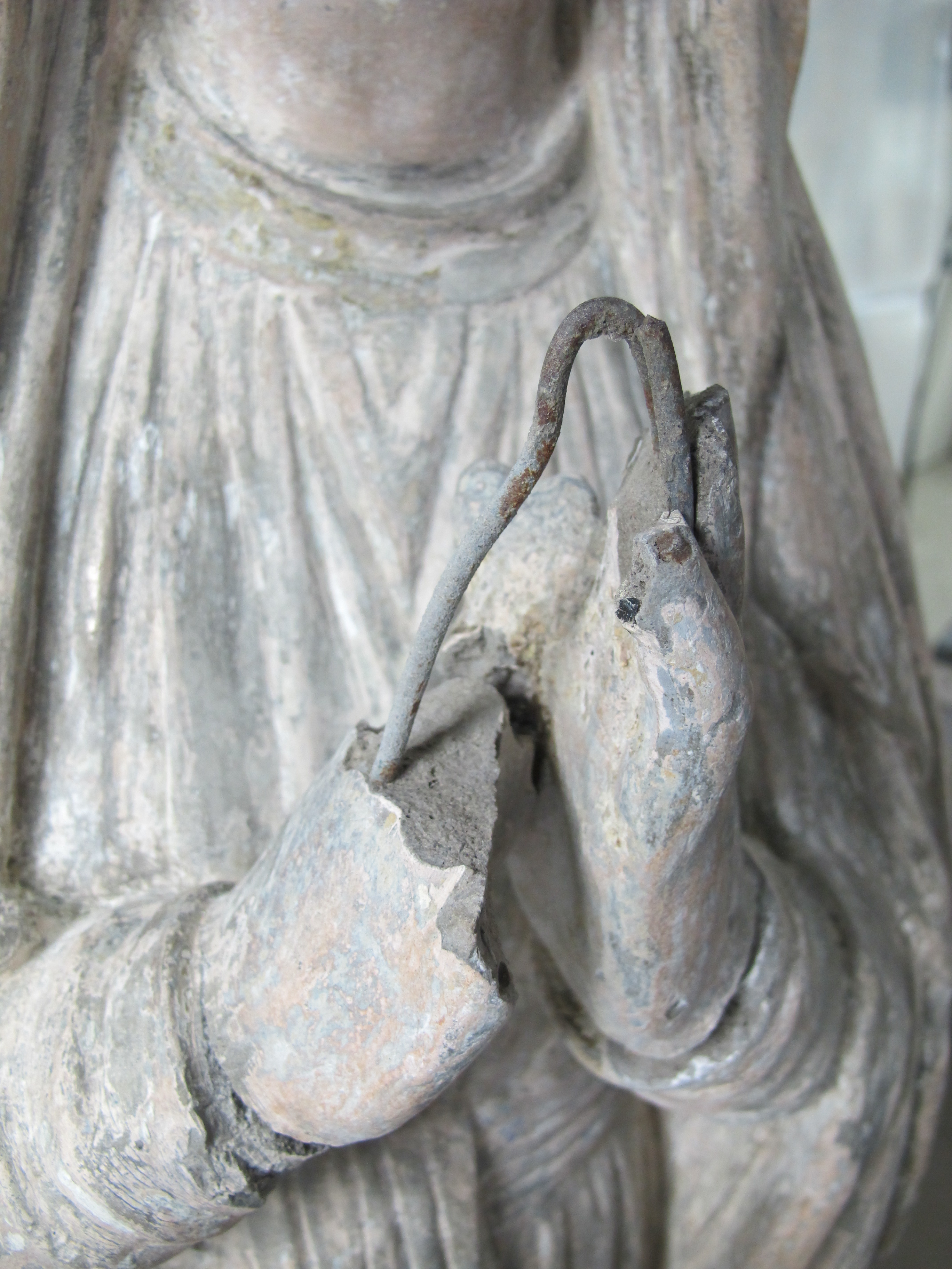 Op foto 13 onderaan op deze pagina zie je een gegoten beeld met een ijzeren armatuur. De handen zijn beschadigd door de corrosie van het ijzer.