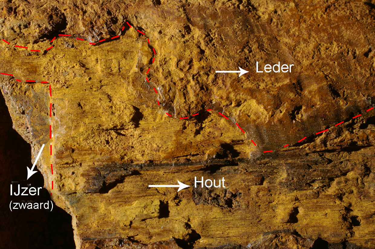 - Hoewel hout in zuurstofrijke bodems nauwelijks overleeft, blijft het wél bewaard in de nabijheid van metalen. Hout rond koperen elementen is dikwijls goed bewaard omdat kopercorrosie giftig is voor veel micro-organismen. In contact met corroderend ijzer raakt het hout bedekt of doordrongen met ijzerzouten. Zelfs wanneer er een negatieve afdruk wordt gevormd in de corrosielaag, kan die de originele houtstructuur tot in de kleinste (microscopische) details weergeven. Op basis van die gemineraliseerde resten kunnen we de houtsoort nog altijd identificeren.
