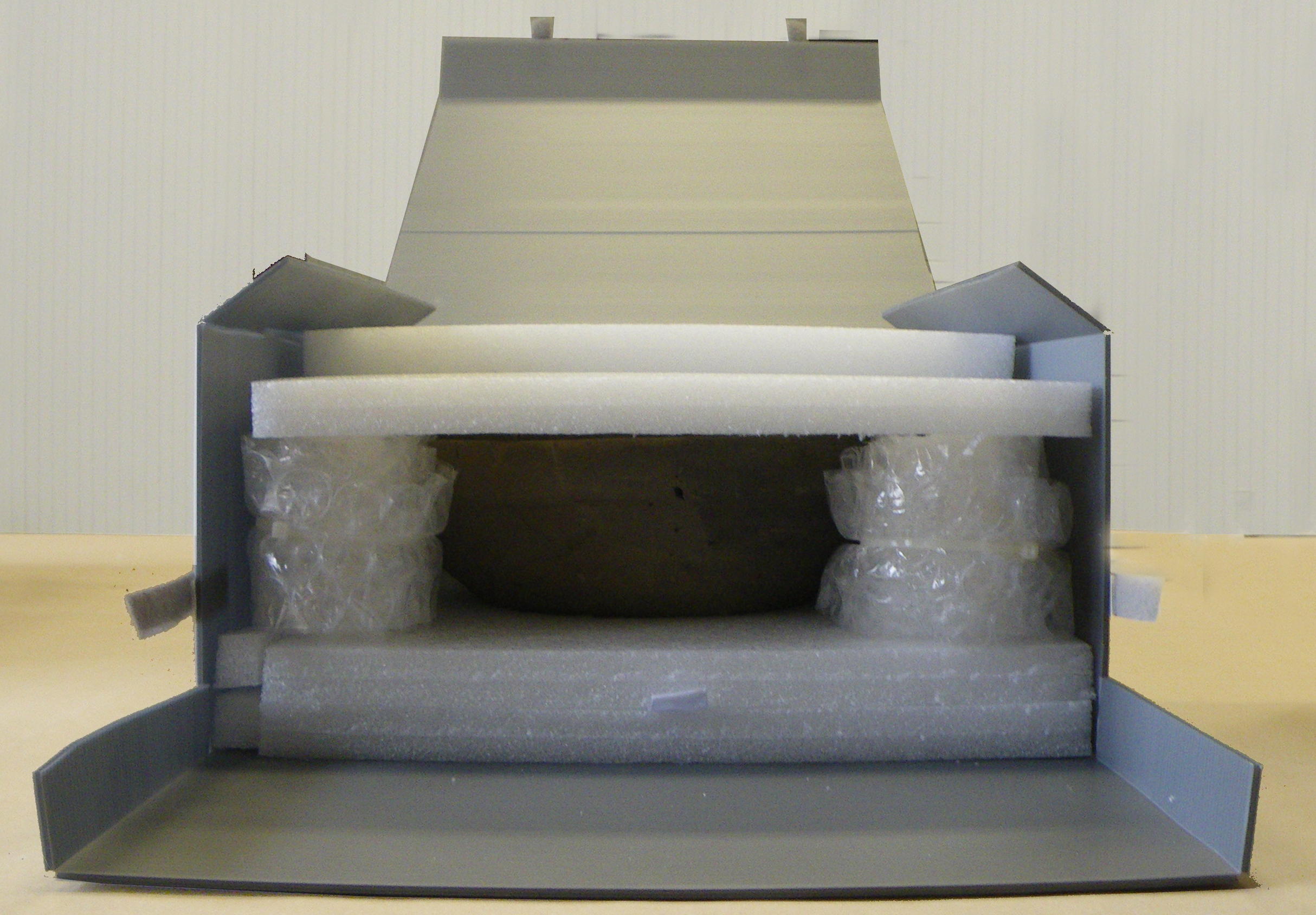 - Voor heel fragiele objecten maak je een verpakking op maat, waarbij je het object uit de doos kan schuiven op een klein platform zonder het aan te raken