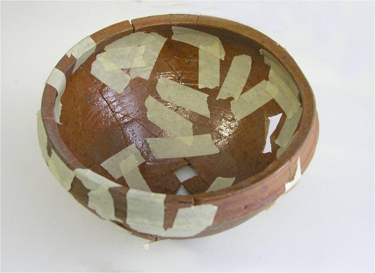 - Scherven puzzelen en verlijmen kan, net als reconstrueren met papiertape, wanneer het oppervlak ten minste niet loskomt samen met de tape. Let op met fragiele keramiek en afwerkingslagen. Papiertape die te lang blijft zitten kan letterlijk een onuitwisbare indruk nalaten. De tape wordt zo snel mogelijk verwijderd.