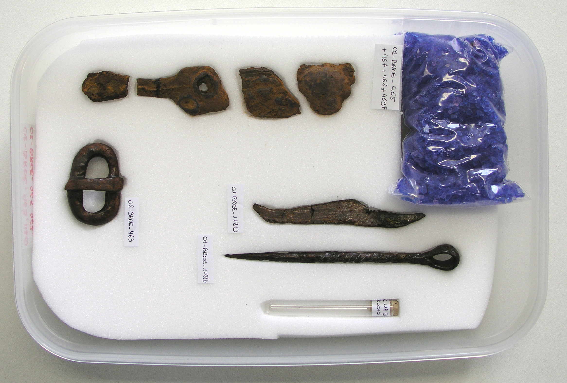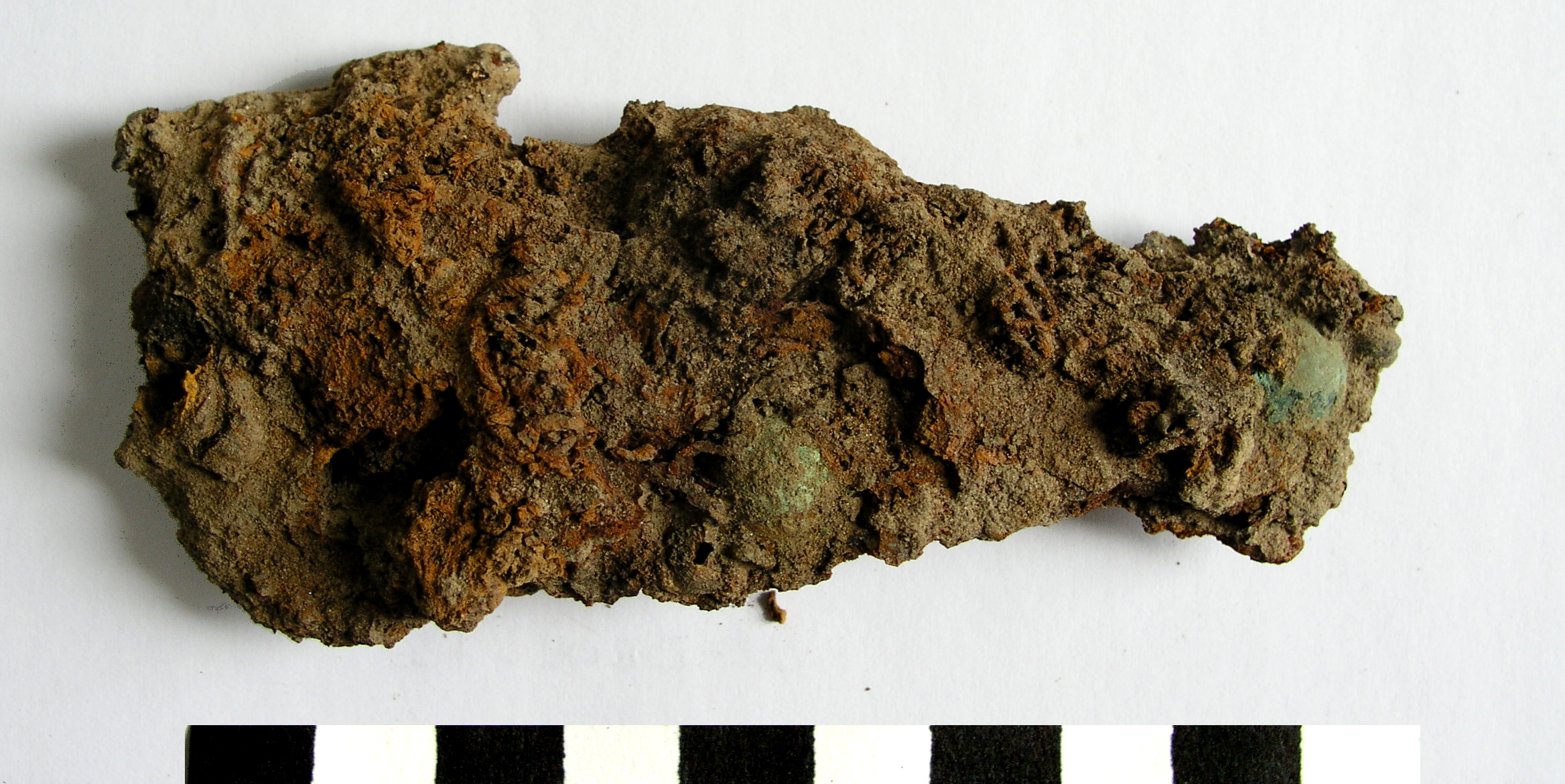 IJzer is het meest fragiele materiaal dat je in de bodem vindt en is dikwijls niet anders te herkennen dan als een verroeste klomp. Houd er steeds rekening mee dat het metaal verdwenen kan zijn en vervangen door corrosieproducten. Toch kan onderzoek hieruit het originele voorwerp afleiden en soms zitten er zelfs nog resten textiel vervat in de corrosiekorst. IJzer is heel gevoelig voor veranderingen in de omgevingsomstandigheden en vereist specifieke bewaringsmaatregelen.