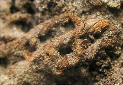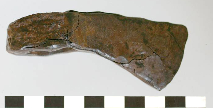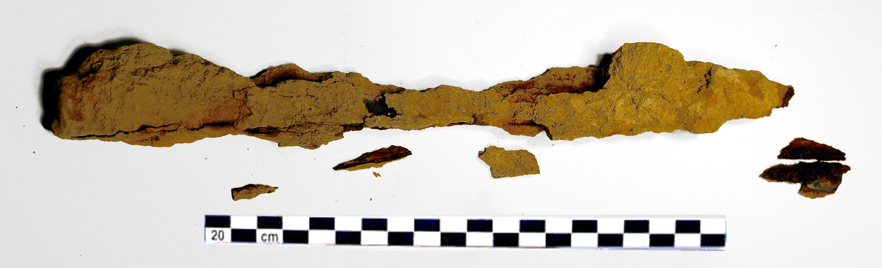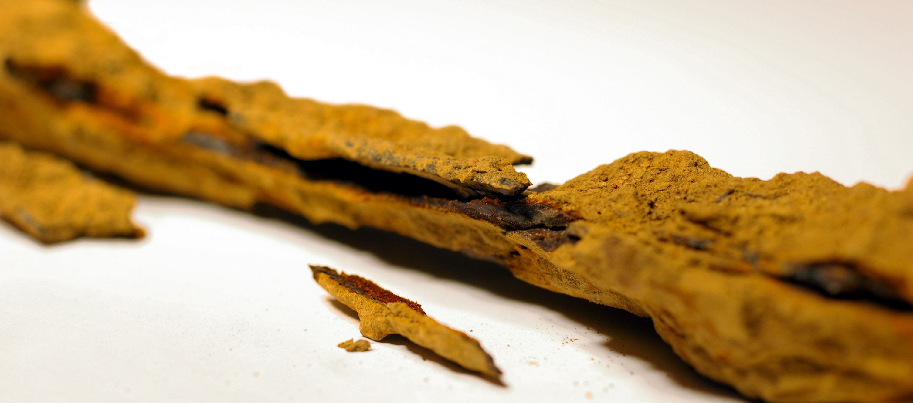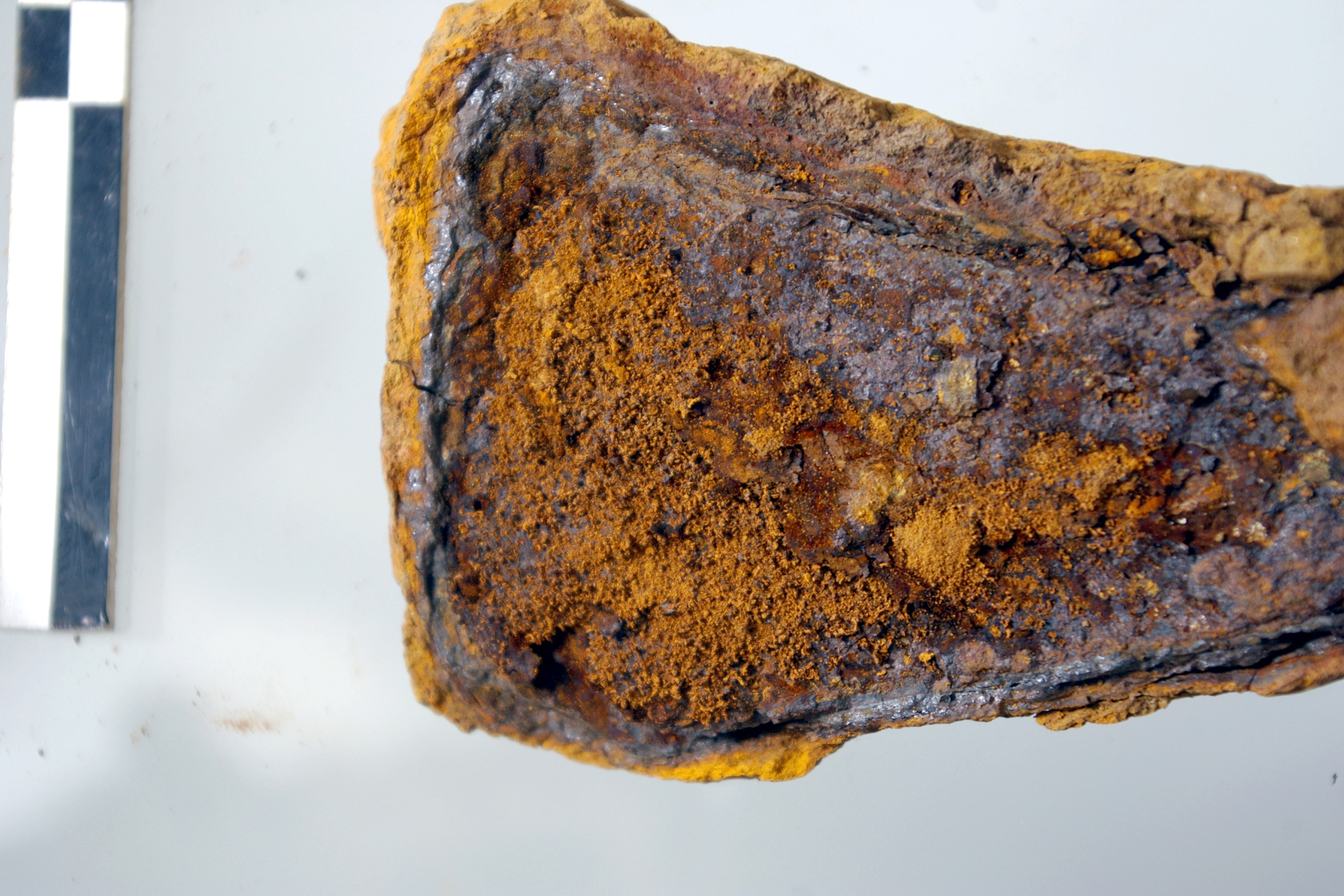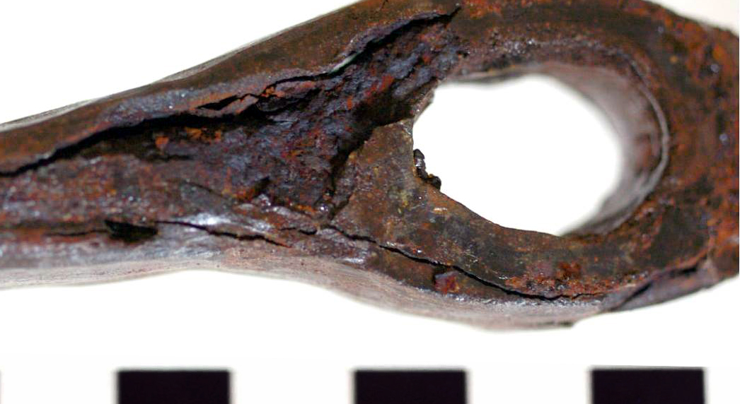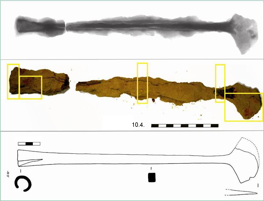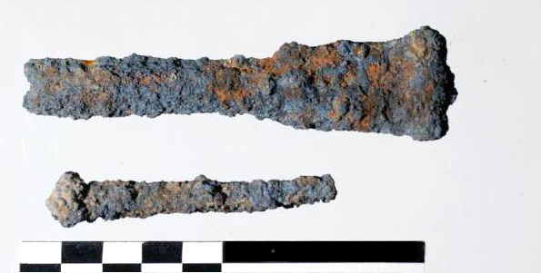 - Op ijzeren objecten vinden we vaak (deels gemineraliseerde) organische resten terug: een handvat, hout van een schacht, textielresten enz. Ze worden steeds vaker het voorwerp van onderzoek en hun belang neemt alsmaar toe.