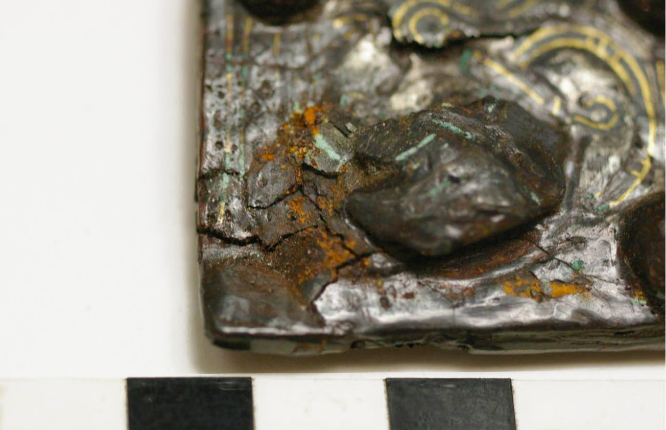 - De kleur van de corrosiekorsten zegt weinig over de inwendige toestand van het object. De oranje, zichtbare, poederige kristallen van de actieve corrosie bevinden zich zelden aan de oppervlakte.