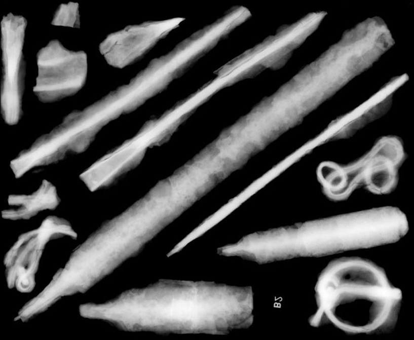 - Eerste fase: objecten identificeren met röntgenopnames. Op basis van de röntgenfoto en de archeologische context maak je in samenspraak met de archeologen een eerste selectie.