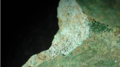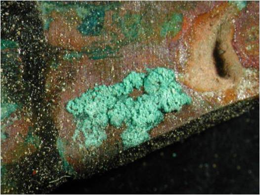 - Uitzicht actieve corrosie: vorming van losse, grote, helgroene tot helblauwe kristallen. Je ziet ze in kleine kratertjes aan het oppervlak. Of ze blijven onder het oppervlak, waar ze een object intern 'verpoederen'.