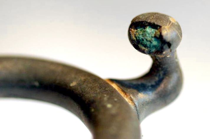 Voorwerpen in koperlegering krijgen tijdens hun gebruiksduur dikwijls een mooie patina. Maar in de bodem komt er een corrosieproces op gang dat zich ook na de opgraving kan voortzetten, soms sluimerend. Een goede bewaaromgeving en regelmatige toestandscontrole in het depot is de boodschap.