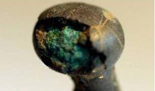 - Bij koperlegeringen let je vooral op helgroene, dikke, losse kristallen (poederig) die aan het oppervlak verschijnen en op (fijne) barstjes in een compacte corrosielaag.