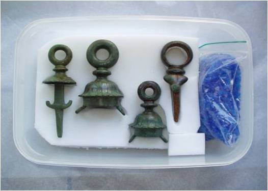 - Vóór een droge bewaring drogen vochtige metalen eerst aan de lucht (max. enkele dagen voor grotere objecten) en worden ze daarna verpakt in een zo droog mogelijke omgeving. Gebruik 100% luchtdichte (curver)dozen, een kleine ruimte die je kan drogen met waterabsorberende silicagelkorrels.