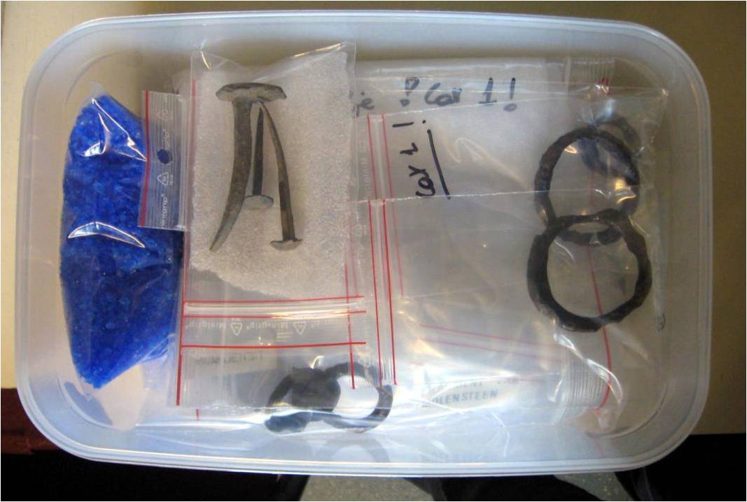 - Natte bewaring: alleen als er een behandeling in het vooruitzicht is (binnen maximum enkele maanden). Het is niet mogelijk deze vondsten lang vochtig te bewaren. Toch is dat bevorderlijk voor latere conserveringsbehandelingen. Indien mogelijk, bewaar je metalen vondsten niet gereinigd (met aangekoekte aarde) in een koelkast. De lage temperatuur vertraagt het corrosieproces en vergemakkelijkt de verdere behandeling.
