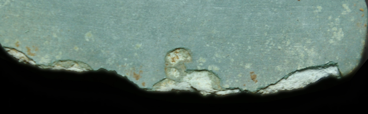 - Ook reeds behandelde objecten met een beschermlaag kunnen actief corroderen. Ook hier zijn de helgroene stippen een indicatie van actieve verwering.