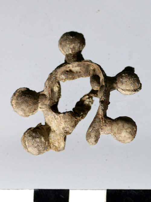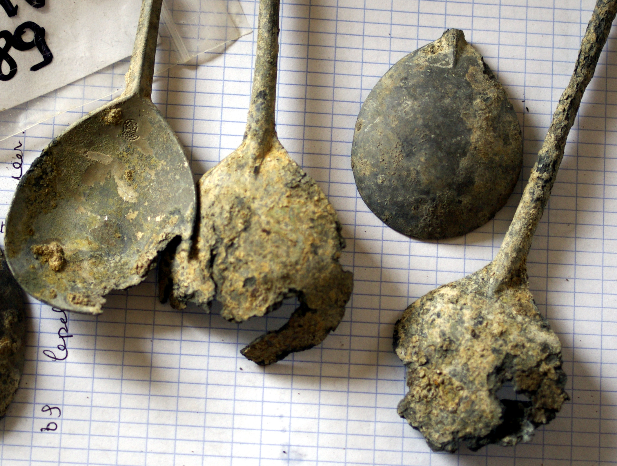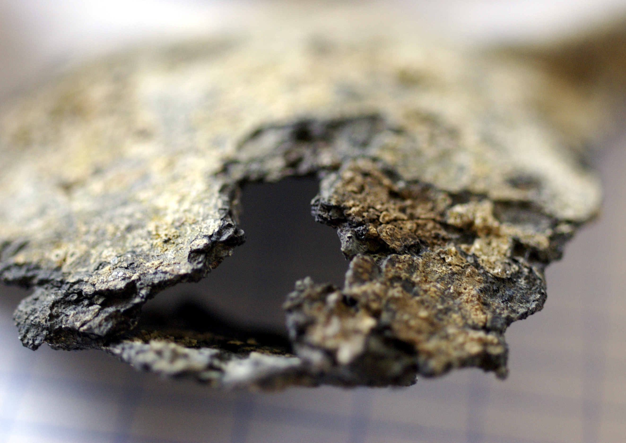 - Dikke corrosielagen op lood en tin zien er vaak uit als een 'gezwollen', witte tot lichtbruine pasta. De dunne patina die de vondsten tijdens hun bovengronds leven ontwikkelen, is een goede beschermingsfilm tegen ondergrondse corrosie.