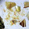 Bij de opgraving vallen email en goudlaagjes snel van het object. Laat dit glas niet uitdrogen.