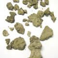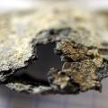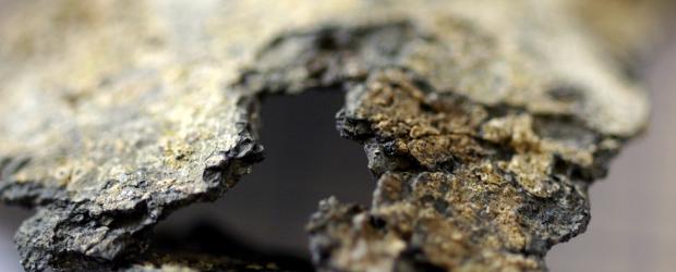 - Dikke corrosielagen op lood en tin zien er vaak uit als een 'gezwollen', witte tot lichtbruine pasta. De dunne patina die de vondsten tijdens hun bovengronds leven ontwikkelen, is een goede beschermingsfilm tegen ondergrondse corrosie.