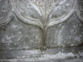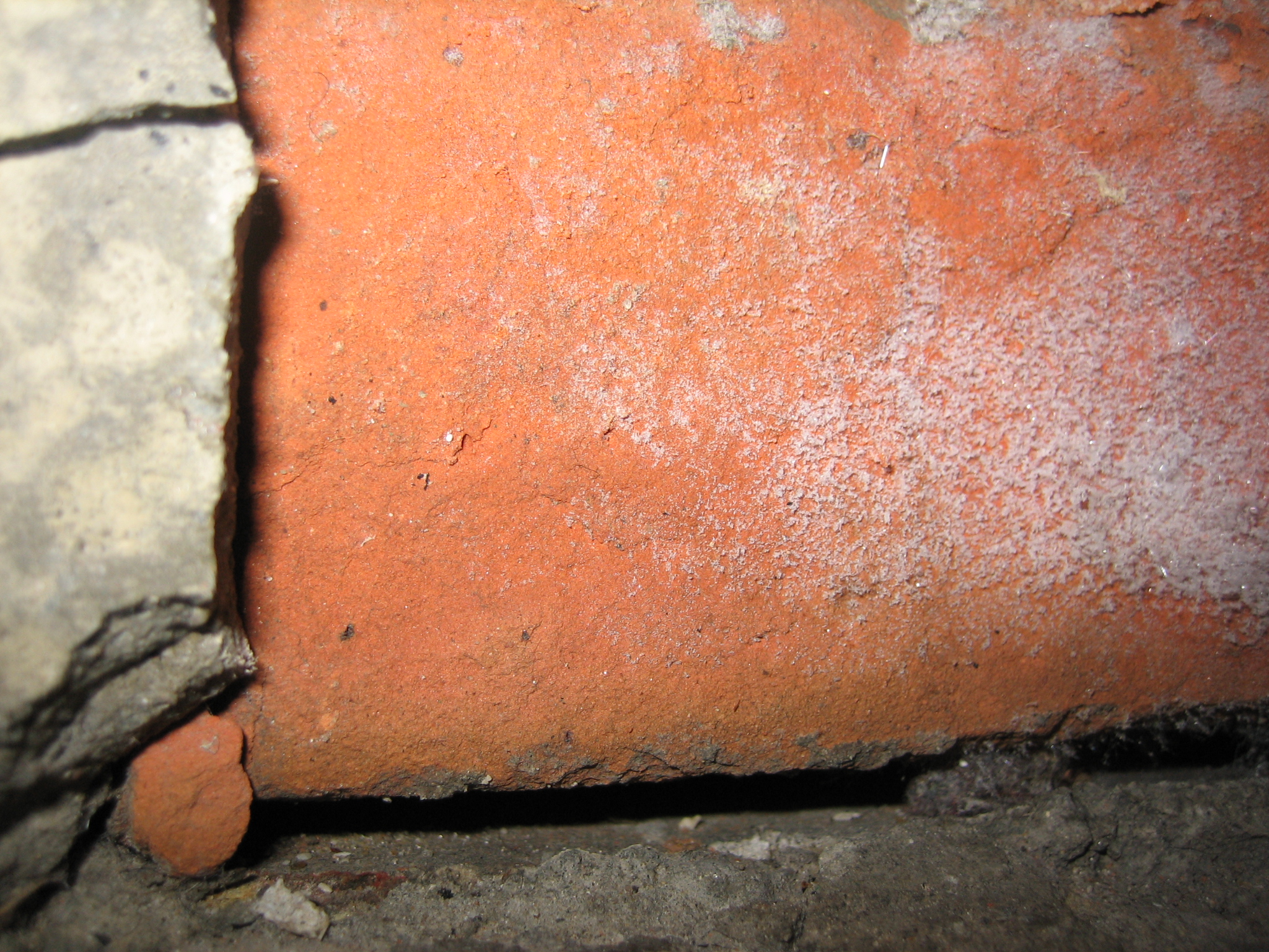 | poreus materiaal dat oplosbare zouten bevat, bv. keramiek of steen in contat met vloer, muurschildering | zoutuitbloei |