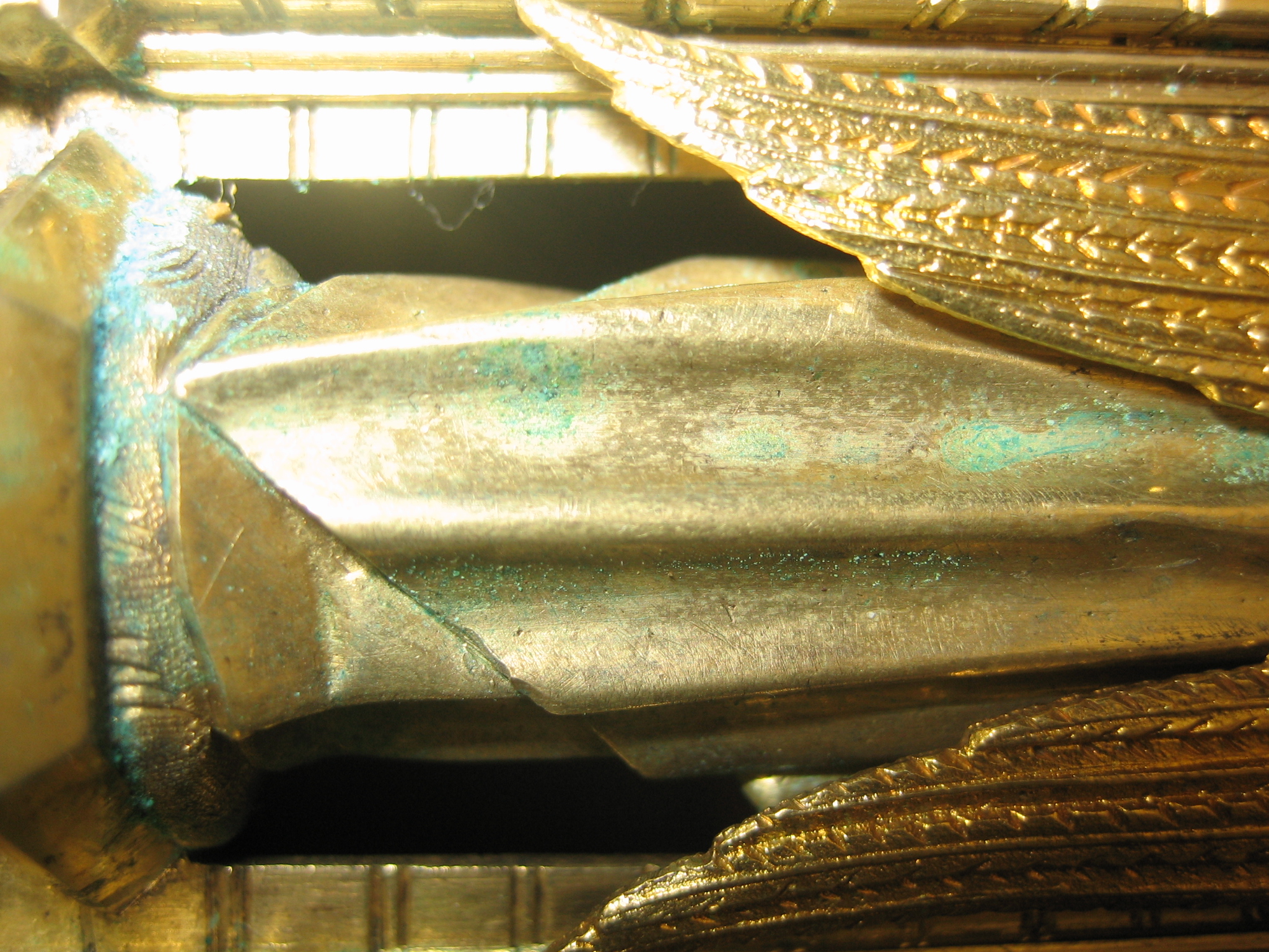 | keramiek | vlekken op poreus oppervlak , zouten of verlies in patine (bij archeologisch keramiek) |